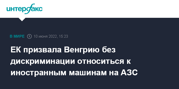 Москва. 10 июня. INTERFAX.RU - В Еврокомиссии (ЕК) ожидают объяснений венгерских властей в ответ на письмо еврокомиссара по внутреннему рынку Тьерри Бретона об ограничениях, введенных для иностранцев на заправках страны, сообщила официальный представитель ЕК Соня Господинова.