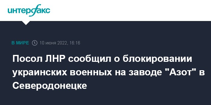 Москва. 10 июня. INTERFAX.RU - Военнослужащие вооруженных сил Украины (ВСУ) оказались заблокированы на территории завода "Азот" в Северодонецке и пытаются выйти на переговоры с союзными силами Луганской народной республики и России, сообщил посол ЛНР в РФ Родион Мирошник.