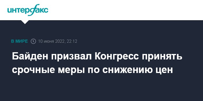 Москва. 10 июня. INTERFAX.RU - Президент США Джо Байден в пятницу призвал Конгресс принять законы с целью как можно скорее добиться снижения цен в стране.