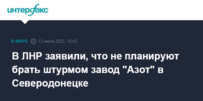 Москва. 12 июня. INTERFAX.RU - В Луганске не планируют брать штурмом завод "Азот" в Северодонецке, где остаются украинские военные, сообщили "Интерфаксу" в воскресенье в народном совете Луганской народной республики.