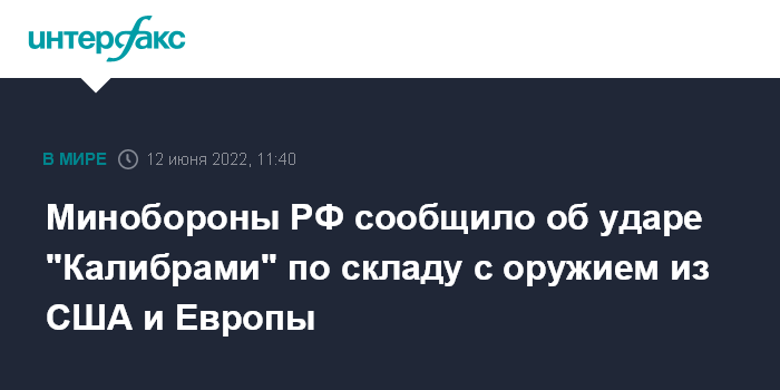 Москва. 12 июня. INTERFAX.RU - Российские военные заявили об уничтожении морскими крылатыми ракетами "Калибр" крупного склада с американским и европейским вооружением в Тернопольской области Украины.