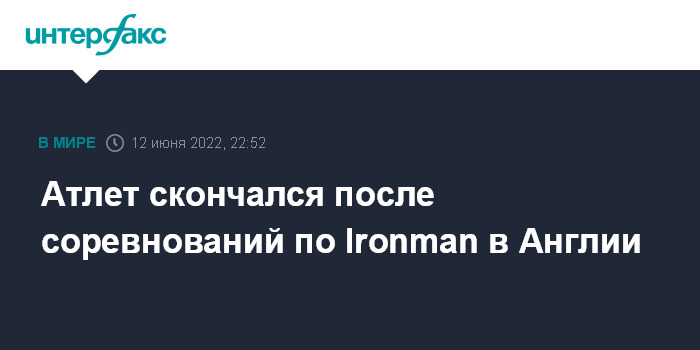 Москва. 12 июня. INTERFAX.RU - Участник триатлона Ironman 70.3 в графстве Стаффордшир скончался вскоре после госпитализации с соревнований, сообщает газета Birmingham Mail.