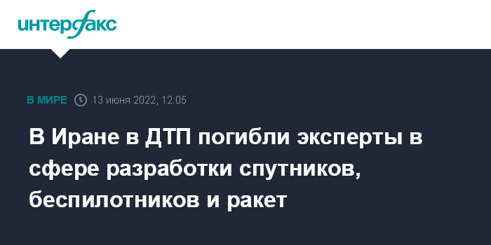 Москва. 13 июня. INTERFAX.RU - Двое представителей Корпуса стражей Исламской революции, занимавшиеся разработкой беспилотников, ракет и спутников, погибли на днях в автокатастрофах, сообщает в понедельник иранское агентство Tasnim.