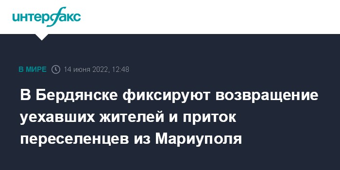 Москва. 14 июня. INTERFAX.RU - Жители Бердянска возвращаются в город, власти фиксируют большой поток людей, сообщил журналистам глава военно-гражданской администрации Бердянска и Бердянского района Александр Сауленко.