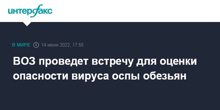 Москва. 14 июня. INTERFAX.RU - Всемирная организация здравоохранения проведет экстренное заседание, в ходе которого обсудит, представляет ли распространяющийся среди людей вирус оспы обезьян опасность для общественного здравоохранения, имеющую международное значение, передают западные СМИ.