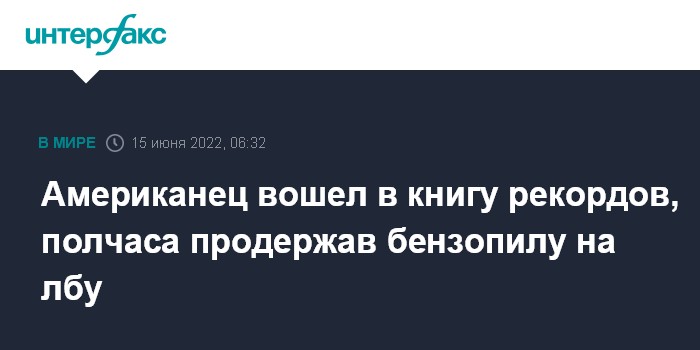 Москва. 15 июня. INTERFAX.RU - Житель штата Айдахо вернул себе титул Книги рекордов Гиннесса, удерживая бензопилу на лбу в течение 31 минуты и 25 секунд, сообщает агентство United Press International.