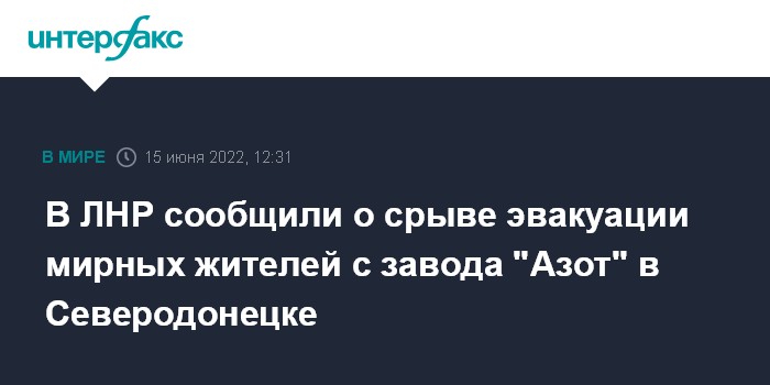 Накануне Минобороны РФ сообщило об открытии с 08:00 до 20:00 15 июня гуманитарного коридора для гражданских лиц с территории комбината "Азот" в Северодонецке.