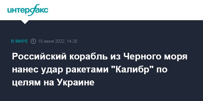 Москва. 15 июня. INTERFAX.RU - Удар четырьмя крылатыми ракетами "Калибр" по военным объектам Украины нанесен российским кораблем из акватории Черного моря, сообщили в Минобороны РФ в среду.