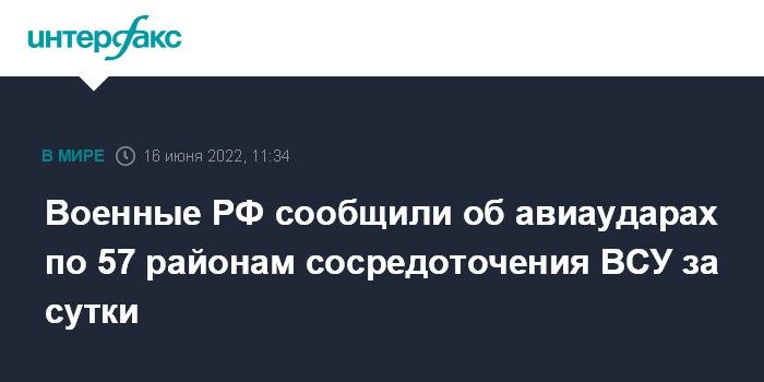Москва. 16 июня. INTERFAX.RU - Российская авиация за сутки нанесла удары по 57 районам сосредоточения украинских войск, сообщил официальный представитель Минобороны РФ Игорь Конашенков.