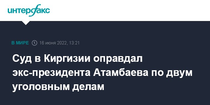 Москва. 16 июня. INTERFAX.RU - Бывший президент Киргизии Алмазбек Атамбаев оправдан по двум уголовным делам, сообщили в четверг "Интерфаксу" в пресс-службе Первомайского суда Бишкека.
