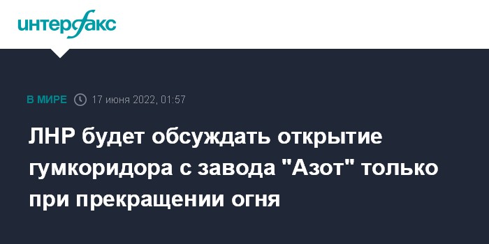 Москва. 17 июня. INTERFAX.RU - Открытие гуманитарных коридоров для выхода мирных жителей с химического завода "Азот" в Северодонецке можно обсуждать при условии соблюдения режима прекращения огня со стороны украинской армии, сообщил посол ЛНР в России Родион Мирошник.
