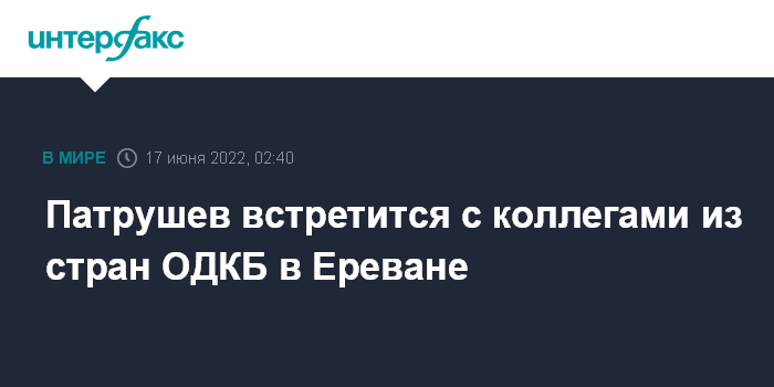 "17 июня в Ереване секретарь Совета безопасности РФ Николай Патрушев примет участие в заседании Комитета секретарей советов безопасности государств ОДКБ", - сообщили в пресс-службе аппарата российского Совбеза.