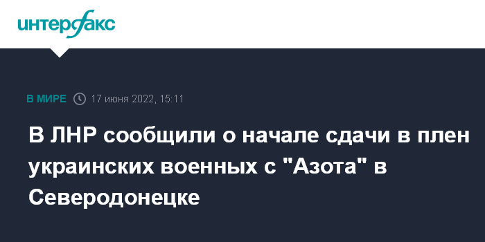 Москва. 17 июня. INTERFAX.RU - Украинские военные на заводе "Азот" в Северодонецке начали сдаваться в плен, сообщил журналистам представитель Народной милиции ЛНР Андрей Марочко.