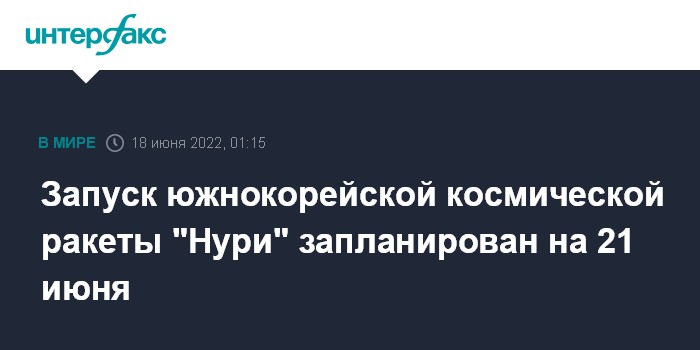 Москва. 18 июня. INTERFAX.RU - Южная Корея объявила о планах запустить космическую ракету собственного производства "Нури" (KSLV-II) 21 июня - после устранения неполадок, сообщает агентство "Ренхап".