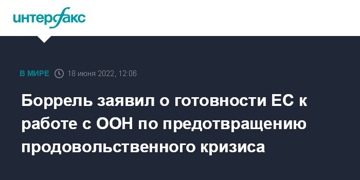 Москва. 18 июня. INTERFAX.RU - По мнению главы дипломатии ЕС Жозепа Борреля, события на Украине "угрожают глобальной волной голода", и ЕС готов работать с ООН для предотвращения продовольственной катастрофы.