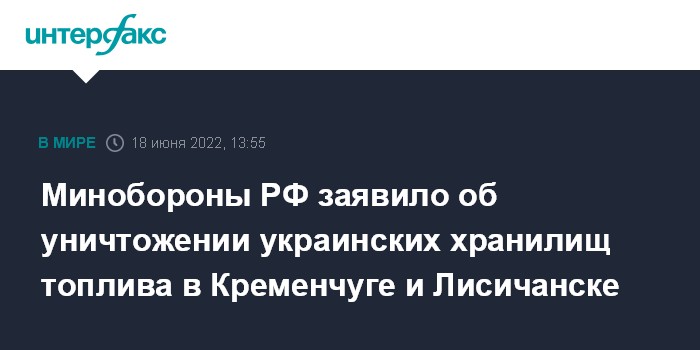 Москва. 18 июня. INTERFAX.RU - Российские военные сообщили об ударах высокоточным оружием по украинским объектам переработки нефти и хранилищ топлива в районе Кременчуга и Лисичанска.