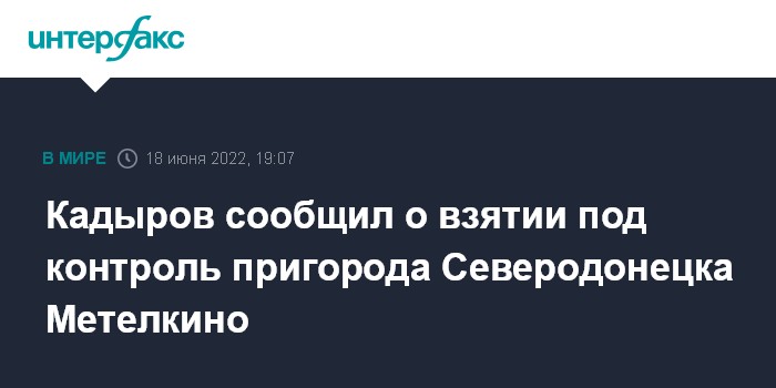 Москва. 18 июня. INTERFAX.RU - Глава Чечни Рамзан Кадыров сообщил о взятии под российский контроль украинского населенного пункта Метелкино, в настоящий момент его зачищают от мин.