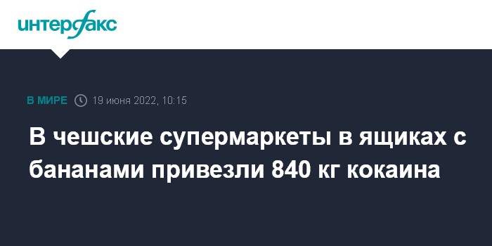Москва. 19 июня. INTERFAX.RU - Сотрудники супермаркетов в чешских городах Йичин и Рихнов-над-Кнежноу, открыв ящики с бананами, обнаружили там свертки с наркотиками. Как сообщает The Guardian, всего в магазины попало около 840 кг кокаина общей стоимостью около 80 млн евро.