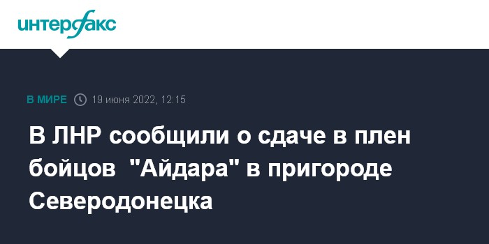 Москва. 19 июня. INTERFAX.RU - Посол Луганской народной республики в РФ Родион Мирошник сообщил о сдаче в плен под Северодонецком бойцов украинского батальона "Айдар".