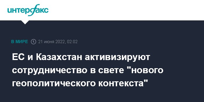 Москва. 21 июня. INTERFAX.RU - Сотрудничество между Казахстаном и Европейским союзом стало более актуальным "в свете нового геополитического контекста", особенно в части сырьевых ресурсов и альтернативных маршрутов, соединяющих Азию и Европу, отмечается в сообщении ЕС по итогам 19-го заседания Совета сотрудничества ЕС-Казахстан, которое состоялось в понедельник в Люксембурге.