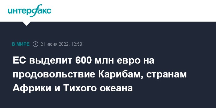 Москва. 21 июня. INTERFAX.RU - Еврокомиссия (ЕК) объявила во вторник, что приняла предложение выделить 600 млн евро из резервов Европейского фонда развития для содействия продовольственной безопасности в странах Африки, Карибского бассейна и Тихого океана.