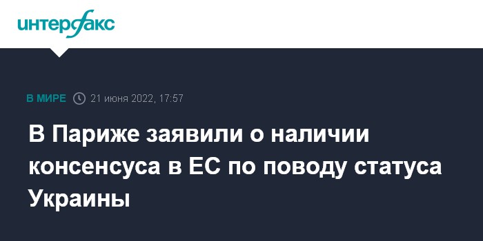 "Сегодня у нас была дискуссия, которая позволила продемонстрировать широкий консенсус, я бы даже сказал, полный консенсус по рассмотрению этих досье. И особенно, что касается Украины, возможности признать статус кандидата в кратчайшие сроки", - сообщил высокопоставленный французский чиновник на пресс-конференции во вторник в Люксембурге после заседания Совета ЕС по общим вопросам, который готовил европейский саммит 23-24 июня.