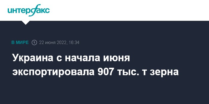 Москва. 22 июня. INTERFAX.RU - Украина за период с 1 по 22 июня 2022 года экспортировала 907 тысяч тонн зерновых культур, в том числе 553 тысячи тонн кукурузы.