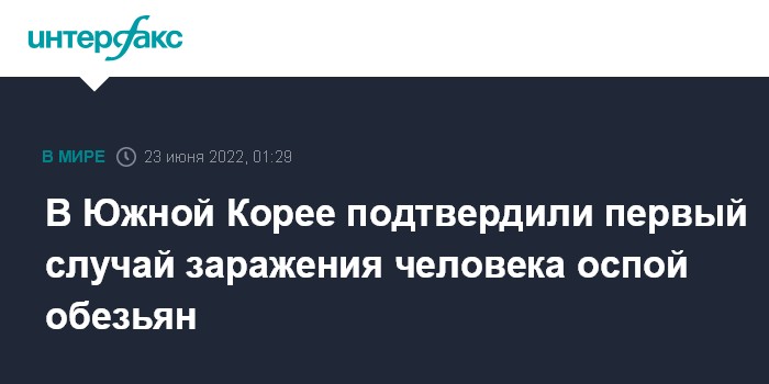 Москва. 23 июня. INTERFAX.RU - В Южной Корее подтвердили первый случай заражения человека оспой обезьян, сообщает агентство "Ренхап".
