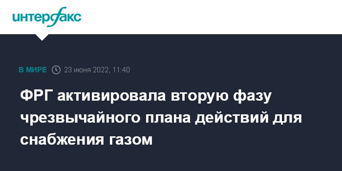 Москва. 23 июня. INTERFAX.RU - Германия активировала вторую фазу своего трехэтапного чрезвычайного плана действий для снабжения газом, власти сообщают, что страна столкнулась с "газовым кризисом", передает в четверг агентство Associated Press со ссылкой на министра экономики страны Роберта Хабека.