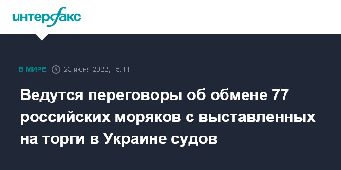 Москва. 23 июня. INTERFAX.RU - Уполномоченный по правам человека в РФ Татьяна Москалькова сообщила, что обсуждается возможность обмена 77 российских моряков с восьми гражданских судов, приписанных к российским портам, которые задержаны на Украине.