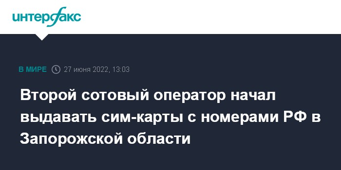 Москва. 27 июня. INTERFAX.RU - Второй оператор сотовой связи - "Мир Телеком" - начал продавать сим-карты с российскими номерами в Запорожской области, сообщили во временной администрации Мелитополя.