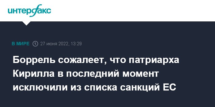 Москва. 27 июня. INTERFAX.RU - Имя предстоятеля Русской православной церкви (РПЦ) патриарха Кирилла не попало в шестой санкционный пакет ЕС в последний момент, написал в своем блоге глава европейской дипломатии Жозеп Боррель.
