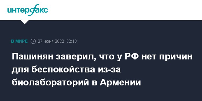 Москва. 27 июня. INTERFAX.RU - Созданные при содействии США биолаборатории являются собственностью Армении, у российских партнеров нет поводов для беспокойства, заявил премьер-министр Армении Никол Пашинян.