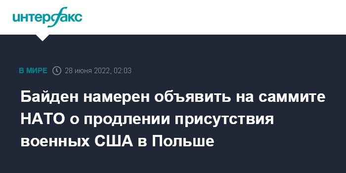 Москва. 28 июня. INTERFAX.RU - Президент США Джо Байден планирует сообщить на саммите НАТО в Мадриде о продлении пребывания части дополнительных американских сил в Польше, сообщает телеканал NBC News со ссылкой на источники.
