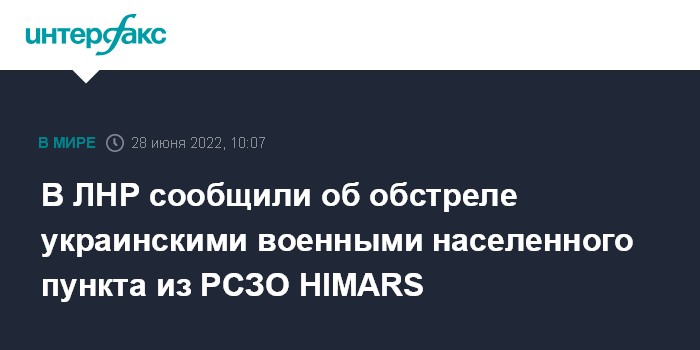 Москва. 28 июня. INTERFAX.RU - Вооруженные силы Украины открыли огонь по территории Луганской народной республики с применением реактивных систем залпового огня американского производства HIMARS, сообщает представительство ЛНР в Совместном центре по контролю и координации режима прекращения огня (СЦКК).