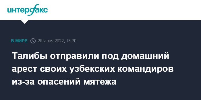 Москва. 28 июня. INTERFAX.RU - Узбекские командиры движения Талибан (запрещено в РФ) находятся под домашним арестом из-за опасений организации мятежа в Афганистане, сообщает интернет газета Hasht-e Subh.