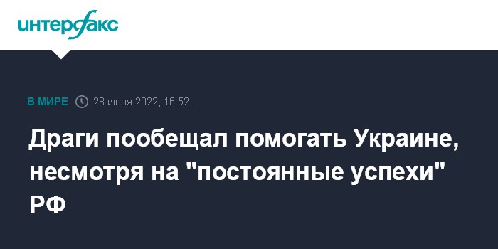 Москва. 28 июня. INTERFAX.RU - Премьер Италии Марио Драги заявил, что его страна готова продолжать оказывать поддержку Киеву, несмотря на военные успехи РФ в рамках спецоперации на Украине.