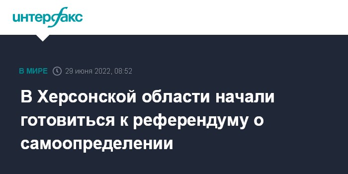 Москва. 29 июня. INTERFAX.RU - В Херсонской области, которую полностью контролируют российские силы, началась подготовка к референдуму о самоопределении, сообщил в видеообращении в Telegram замглавы временной администрации региона Кирилл Стремоусов.