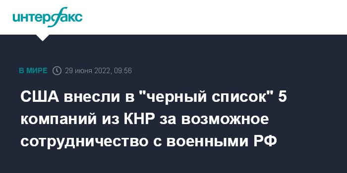 Москва. 29 июня. INTERFAX.RU - Министерство торговли США внесло в "черный список" пять китайских компаний из-за подозрений в сотрудничестве с вооруженными силами России до и после начала военной спецоперации на Украине, пишет Financial Times.