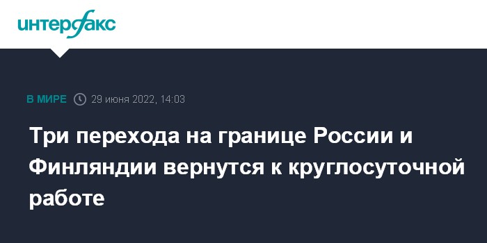 Москва. 29 июня. INTERFAX.RU - Крупнейшие переходы на финско-российской границе Валимаа, Нуйямаа и Иматра с 1 июля снова будут работать круглосуточно, сообщил Департамент пограничной службы Финляндии. Прежде их работа была ограничена из-за пандемии.