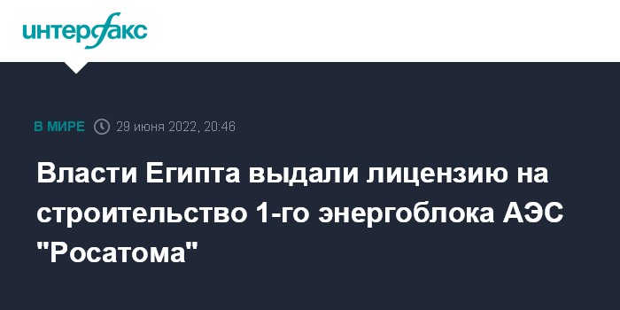 Москва. 29 июня. INTERFAX.RU - Власти Египта выдали лицензию на строительство первого энергоблока АЭС "Эль-Дабаа", сообщило Управление по атомным станциям страны.