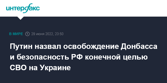 "Конечная цель мной обозначена - это освобождение Донбасса, защита этих людей, и создание условий, которые гарантировали бы безопасность самой России. Вот и все. И работа идет спокойно, ритмично. Ну, как вы видите, войска двигаются и достигают тех рубежей, которые ставятся в качестве задач на определенном этапе этой боевой работы. Все идет по плану", - сказал Путин.