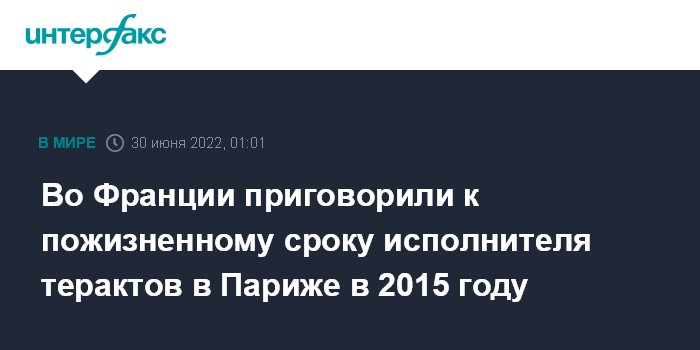 Москва. 30 июня. INTERFAX.RU - Суд во Франции приговорил к пожизненному тюремному заключению Салаха Абдеслама - единственного оставшегося в живых исполнителя кровопролитных терактов 13 ноября 2015 года в Париже.