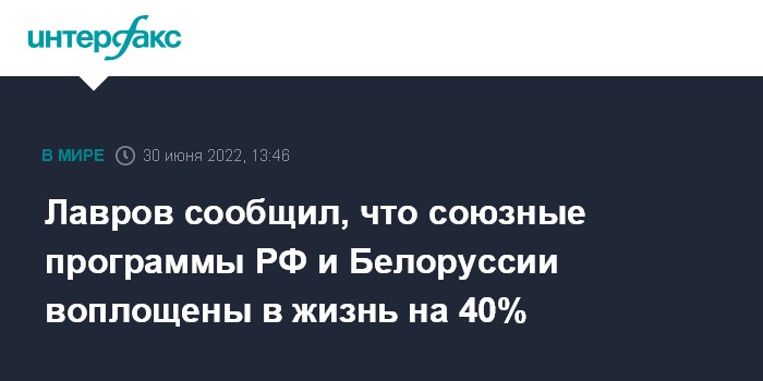 Москва. 30 июня. INTERFAX.RU - Россия и Белоруссия на практике воплотили порядка 40% союзных программ, заявил в четверг журналистам министр иностранных дел России Сергей Лавров после встречи с президентом Белоруссии Александром Лукашенко.