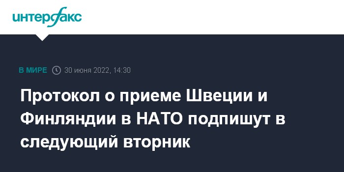 Москва. 30 июня. INTERFAX.RU - Руководство НАТО подпишет протокол о вступлении Швеции и Финляндии в альянс в следующий вторник, 5 июля, заявил в четверг генсек организации Йенс Столтенберг.