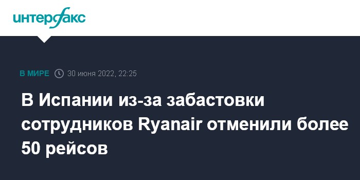Москва. 30 июня. INTERFAX.RU - Несколько десятков авиарейсов авиакомпании Ryanair отменены в четверг в аэропортах Испании из-за забастовки сотрудников, сообщают европейские СМИ.