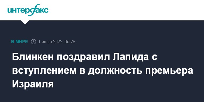 Москва. 1 июля. INTERFAX.RU - Госсекретарь США Энтони Блинкен от имени американского правительства поздравил Яира Лапида с вступлением в должность премьер-министра Израиля.