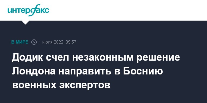 Москва. 1 июля. INTERFAX.RU - Представитель Республики Сербской в президиуме Боснии и Герцеговины (БиГ) Милорад Додик назвал незаконным намерение Лондона отправить в страну британских военных экспертов.