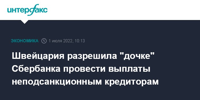 Москва. 1 июля. INTERFAX.RU - Швейцарская Служба по надзору за финансовыми рынками (Financial market supervisory authority, FINMA) частично ослабила защитные меры в отношении Sberbank (Switzerland) AG ("дочка" Сбербанка России), разрешила удовлетворить требования кредиторов, не находящихся под санкциями, говорится в сообщении швейцарского регулятора.