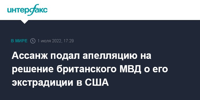 Москва. 1 июля. INTERFAX.RU - Основатель Wikileaks Джулиан Ассанж подал апелляцию на решение британских властей о его экстрадиции в США, сообщает в пятницу The Wall Street Journal.